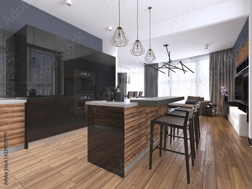 Modern Kitchen With Wood And Gloss Black Kitchen Cabinets
